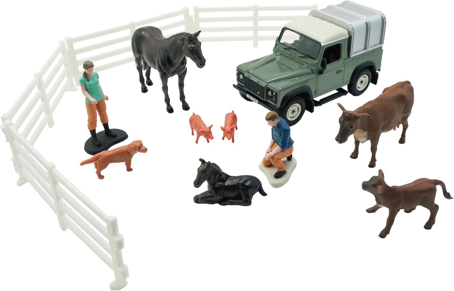 Tomy Britains Land Rover Vet 24 piece Playset includes 1:32 scale toy Land Rover, vet, farm animal figures and vetinary tools suitable for ages 3+ years.